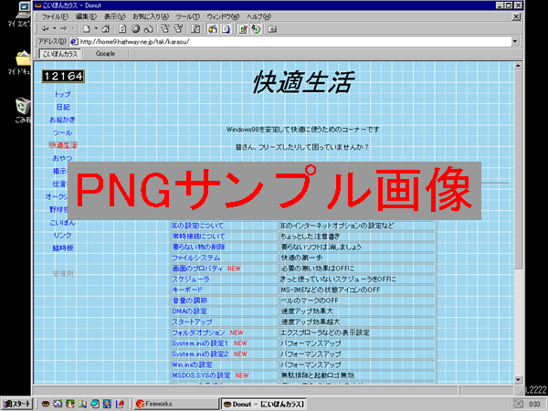 InternetExplorerでPNGを開けない、又は開くときにクイックタイムを使用して開いてしまい 時間がかかったり、右クリックで保存が出来ない人にオススメです。 PNGサンプル ←これを開いて確かめてください。上記の状態になった人は こちらをDLしてダブルクリックすればOKです→「IE-PNG.REG」 再起動後に有効になります。これで他のGIFやJPEGと同じように開けると思います。 あとクイックタイムでのPNGのプラグインを使用しない設定にすると良いです。